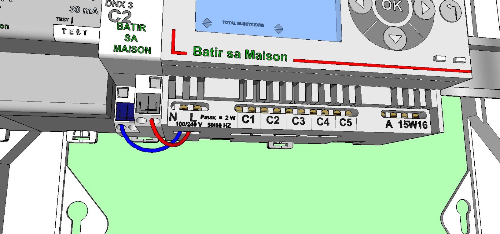 Alors pour commencer cette appareil doit être alimenté et protégé par un disjoncteur divisionnaire de calibre 2 Ampères.