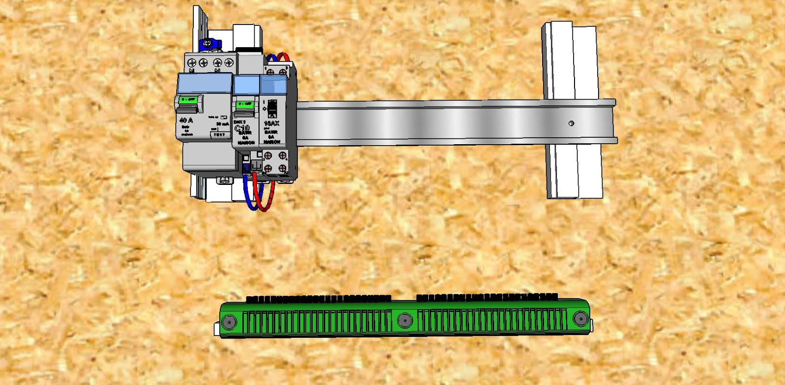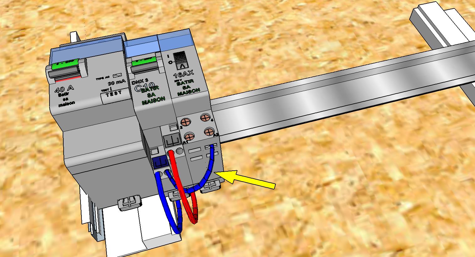 Un disjoncteur différentiel 40A / 30ma (cela peut être aussi un 63A / 30ma) en tête de Rail, un disjoncteur divisionnaire thermique de 10A pour protéger la ligne en amont du Télérupteur.
