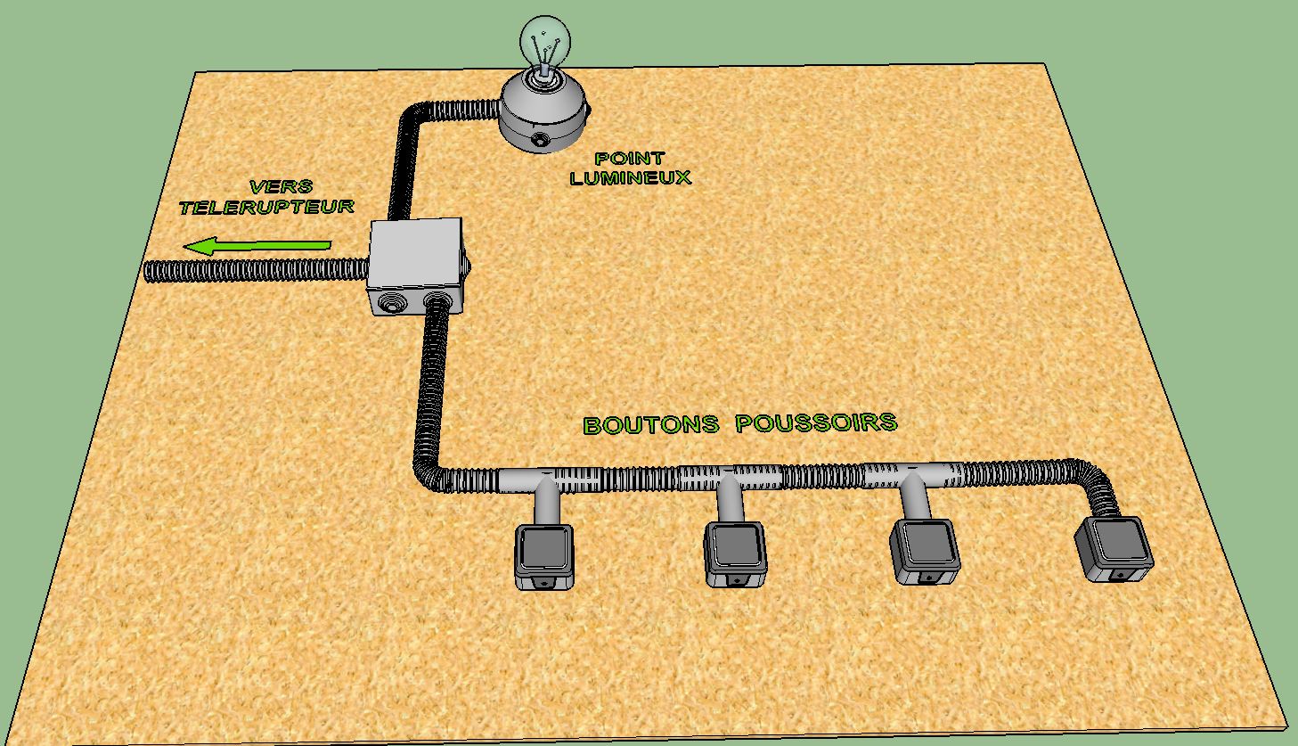 Voilà l’installation d’éclairage avec un Télérupteur bipolaire est terminée, ce genre d’installation est idéale pour les cages d’escalier, ou les couloirs desservant plus de trois locaux.