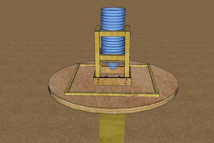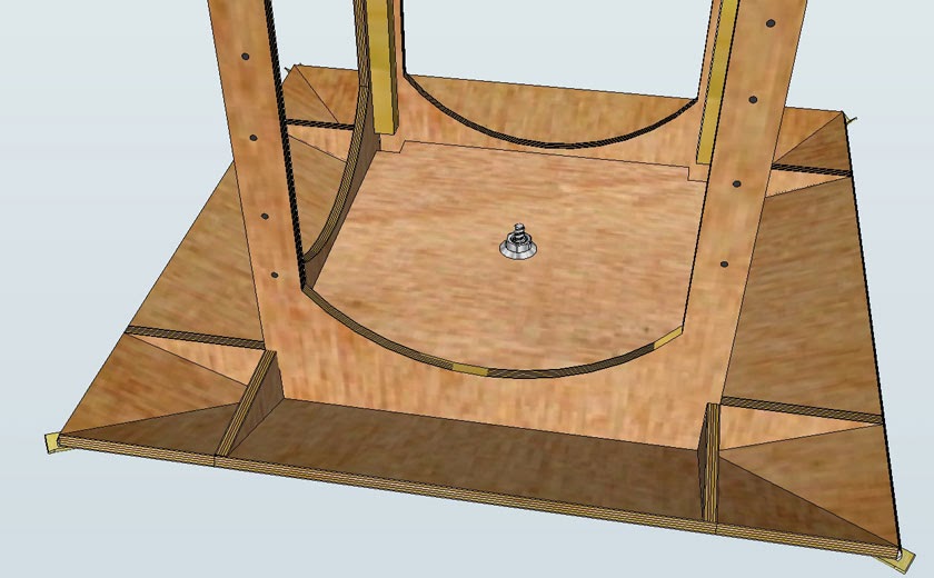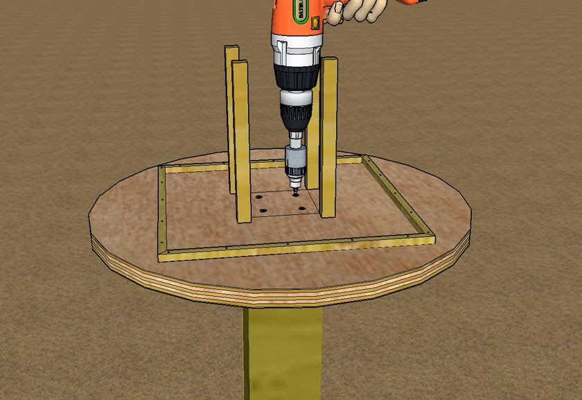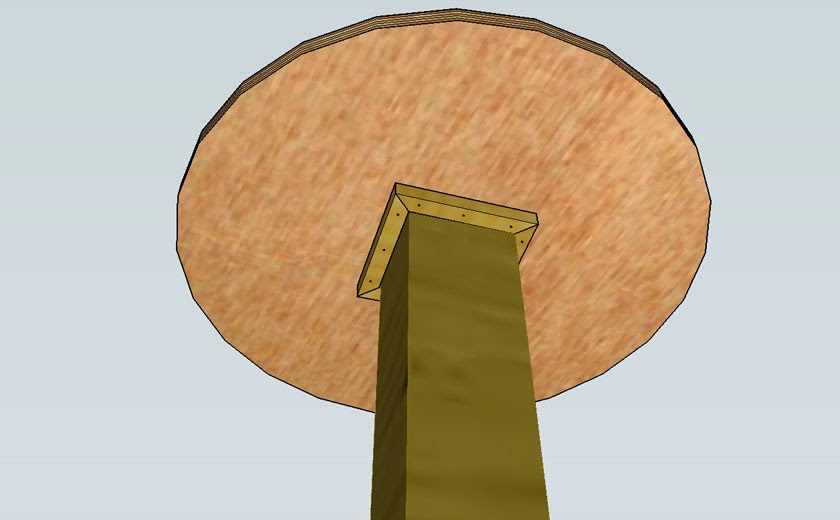 je fixe le plateau sur le pied il est parfaitement centré, grâce à l’encoche créée auparavant par les morceaux de tasseau !