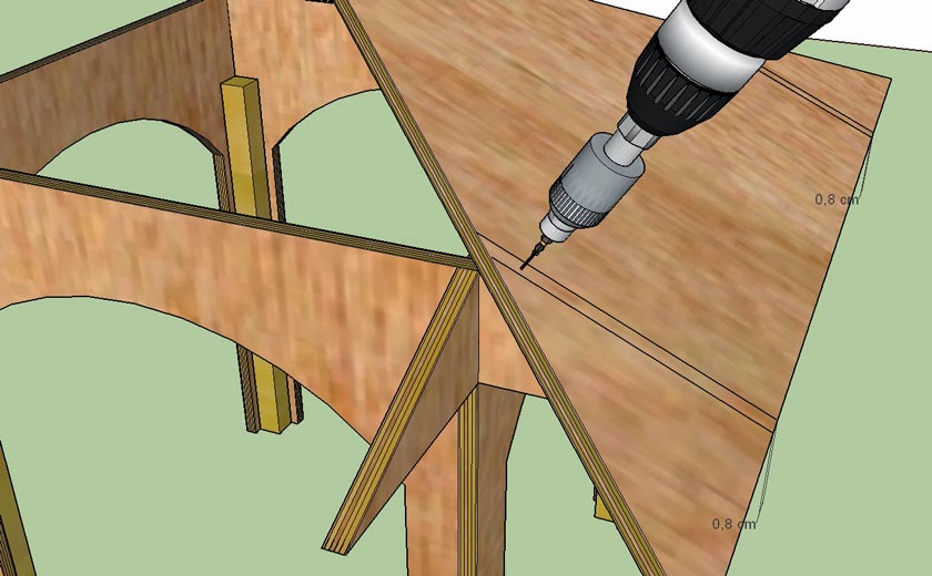 Je présente tour à tour les morceaux précédents, que je positionne et perce avec le foret de 8 mm des trous suffisamment profonds pour que les tire-fonds puissent amorcer leur pénétration.