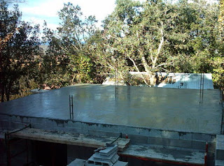 je pose les poutrelles précontraintes et les hourdis, je place les pannelles comme précédemment pour la première partie de la construction, je ferraille, et je coule la dalle a l’aide de la pompe à béton et du produit tout prêt, du 350,(350 kg de ciment par mètre cube).