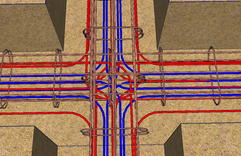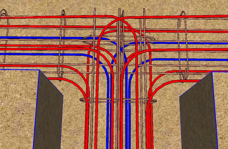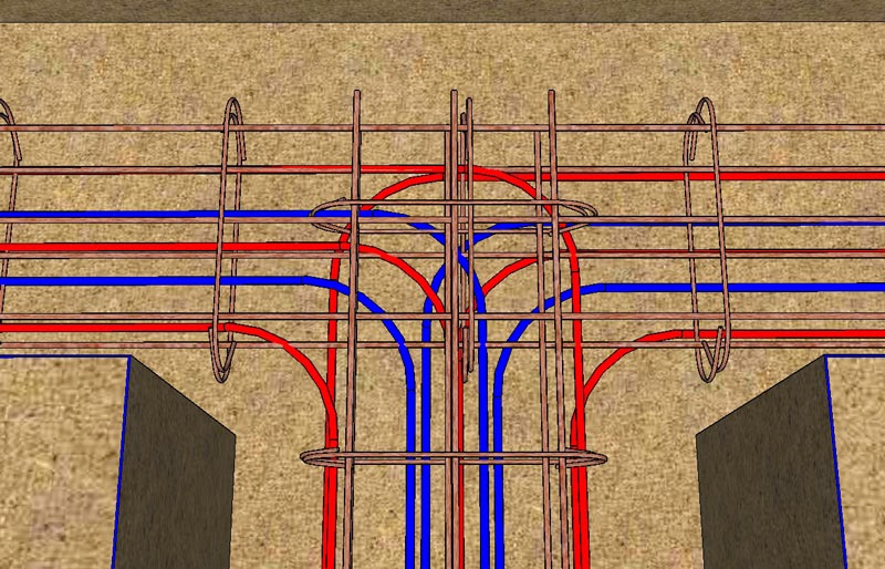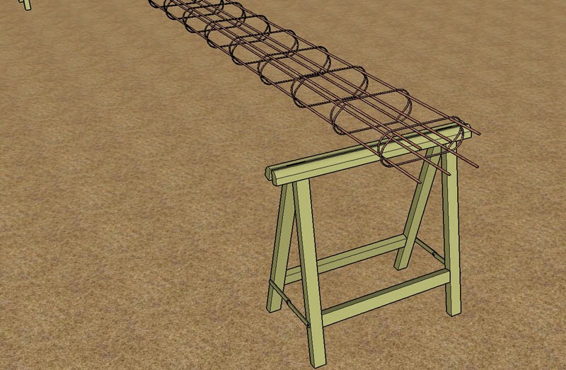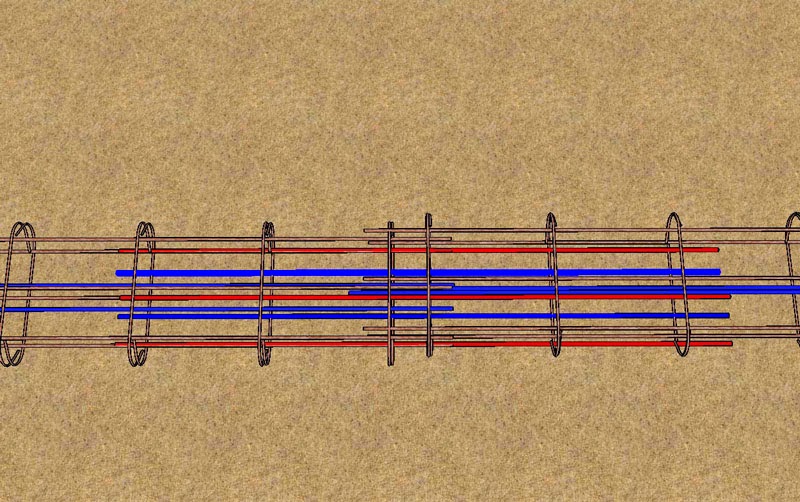 Nous rajoutons dans toutes les longueurs d’armatures longrines, deux fers de 12 mm de section, matérialisés ici en bleu !