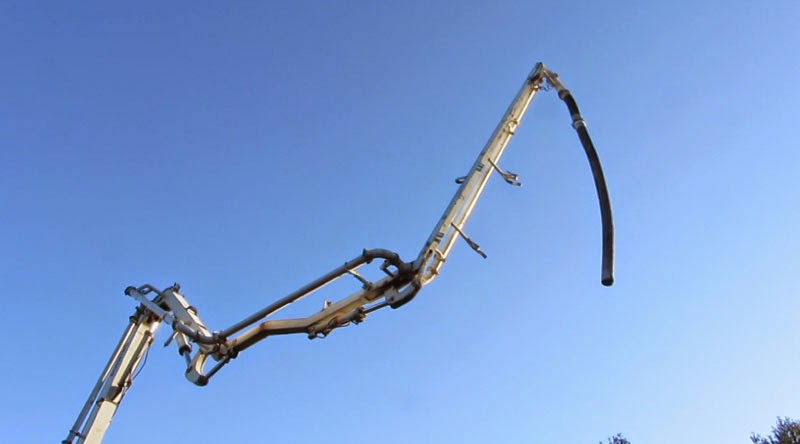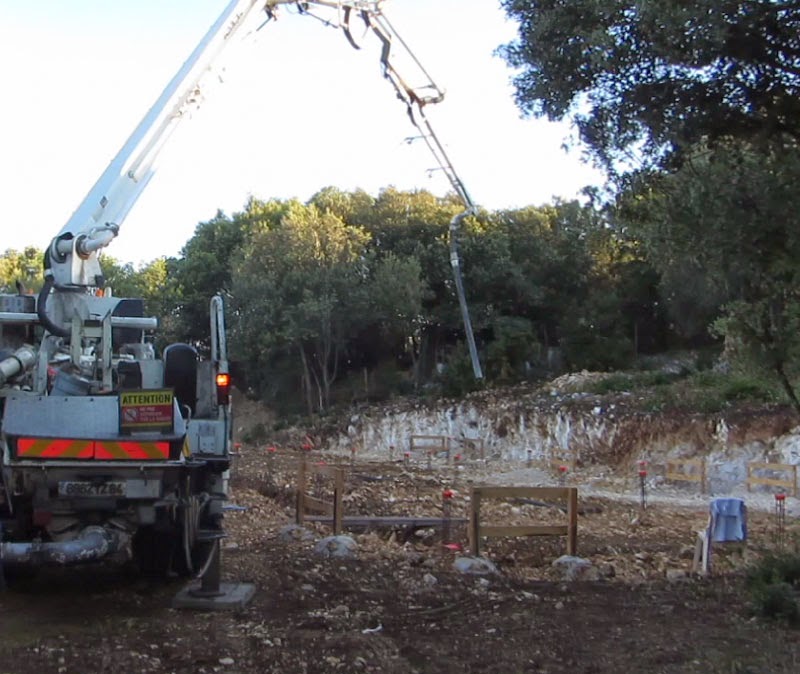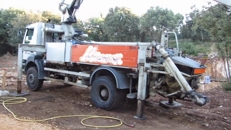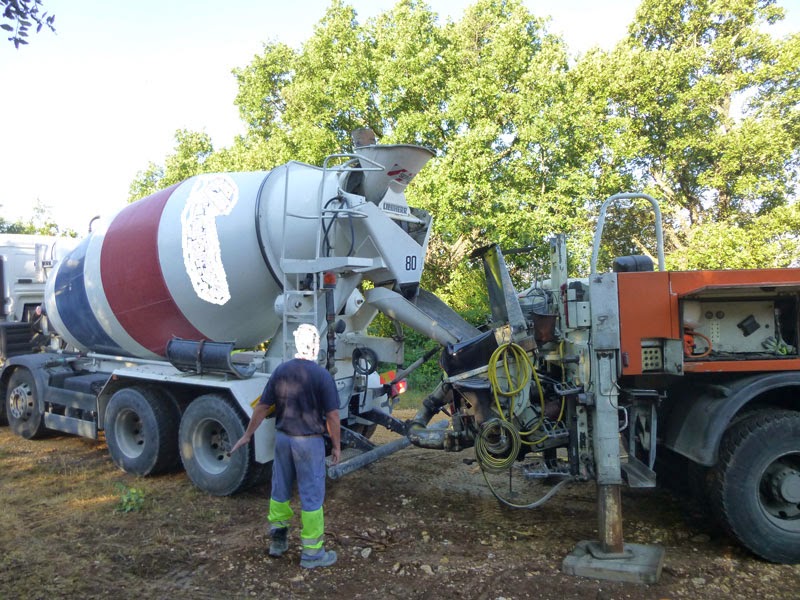 Quelques minutes plus tard la première toupie arrive avec ses 8 mètres cubes de béton dosé à 350 kgs de ciment au cube !