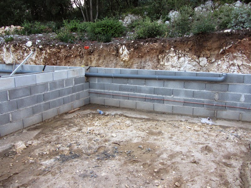 Ceci fait, nous posons au mortier les premiers blocs béton !