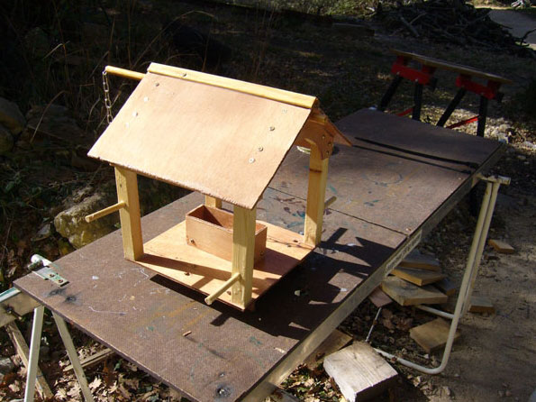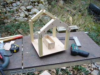 A noter que cette mangeoire peut aussi comporter un pied pour une mise en situation au sol, pour cela une longueur de deux mètres de carré bois de 40mm X40mm suffirait, en coupant un morceau d’un mètre et quatre de 25cm , montée comme ceci : croquis en 3D !