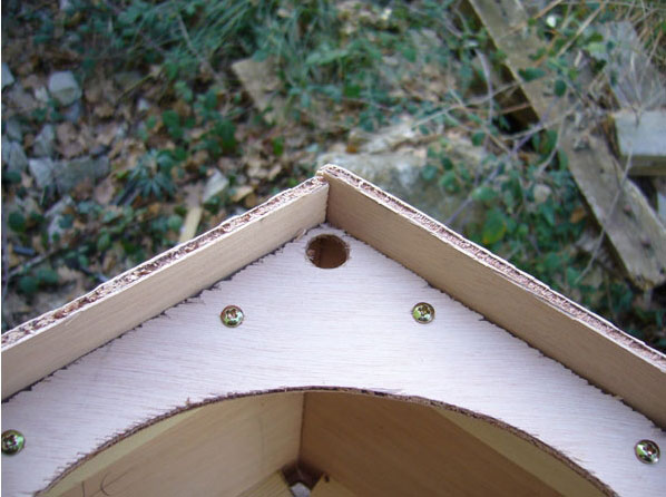 Dans ces trous j’introduis les quatre petits morceaux de rondins, qui feront d’excellents perchoirs !