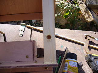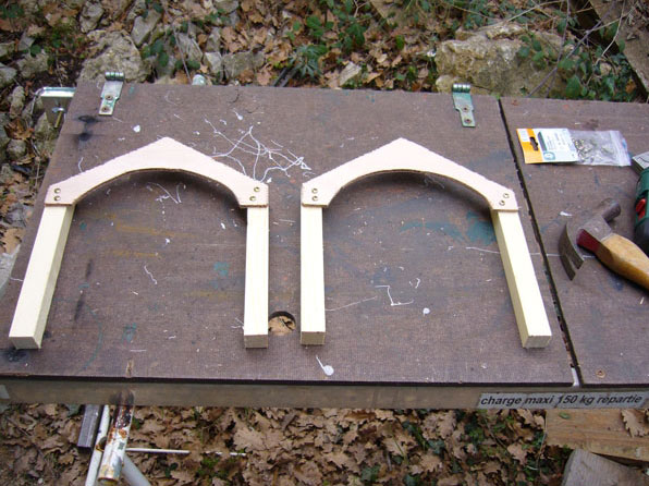 Pour consolider (je ne l’avais pas prévue au départ), je coupe dans les chutes de contreplaqué deux morceaux de 25cm X 2,5cm que je fixe entre les « chapeaux de gendarme » comme ceci !