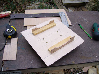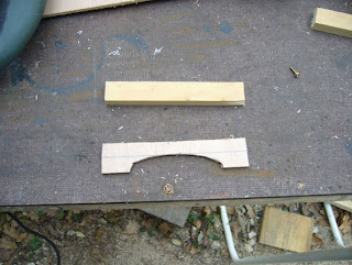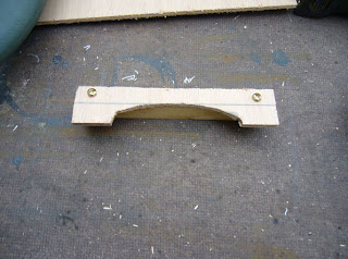 Je coupe aussi dans les chutes de contre plaqué deux petits rectangles de 15cm x 3cm, dans lesquels je découperai un petit arc de cercle de 9cm X1cm, cette encoche épousera je l’espère la forme de la main courante du garde-corps !