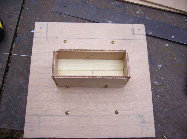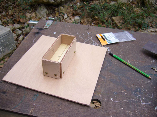 Je trace maintenant à chaque angle du socle un petit carré de 25mm de coté, au centre desquels je perce un trou avec une mèche à bois de 2mm de diamètre !