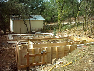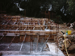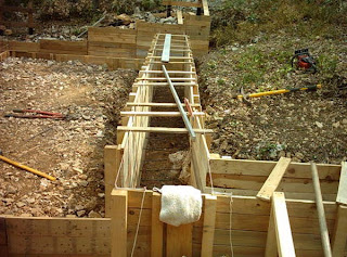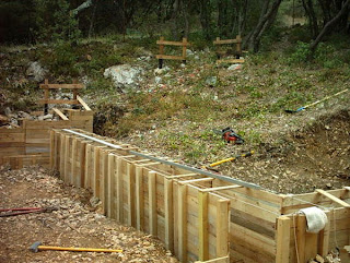 Voila le coffrage du mur central de la deuxième partie, je procède toujours en creusant et coffrant chaque morceau, pour éviter que les tranchées ne se rebouche par l’action des intempéries.