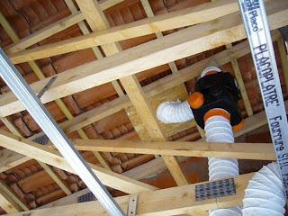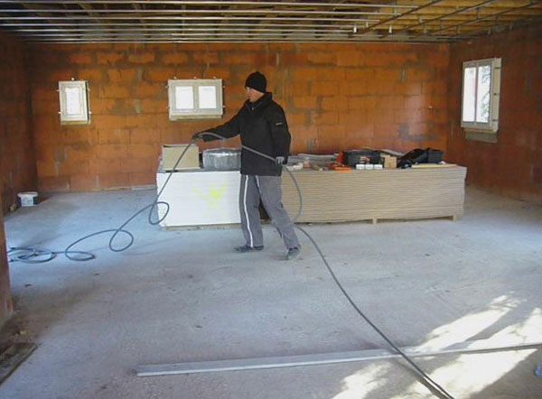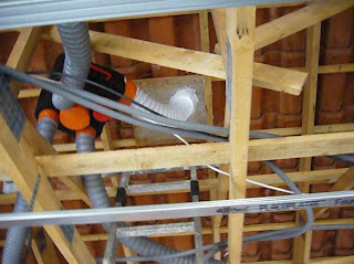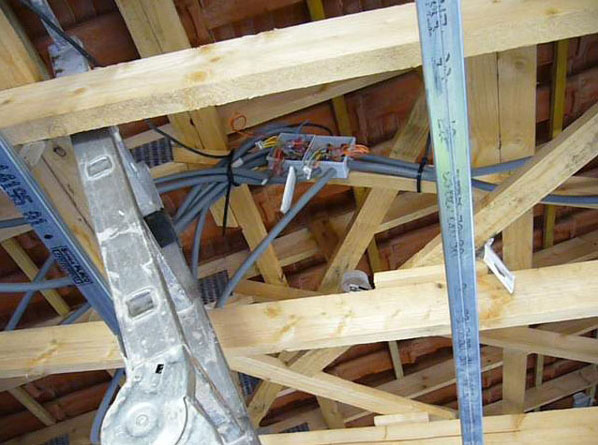 Avant de poser les plaques de plâtre du plafond, il faut tirer toutes les lignes pouvant passer par le haut (dans les combles fermettes):