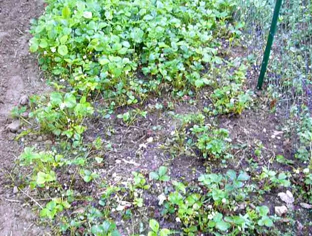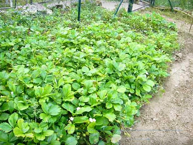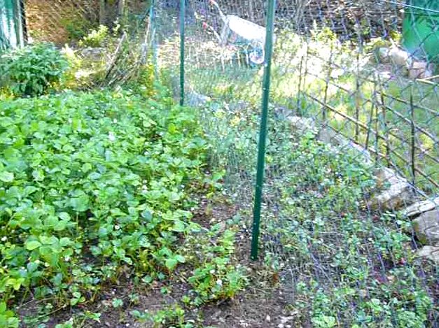 A l’opposé de l’autre coté du potager j’ai créé de chaque coté du grillage, une partie à l’intérieur et l’autre à l’extérieur un coin de fraisier.