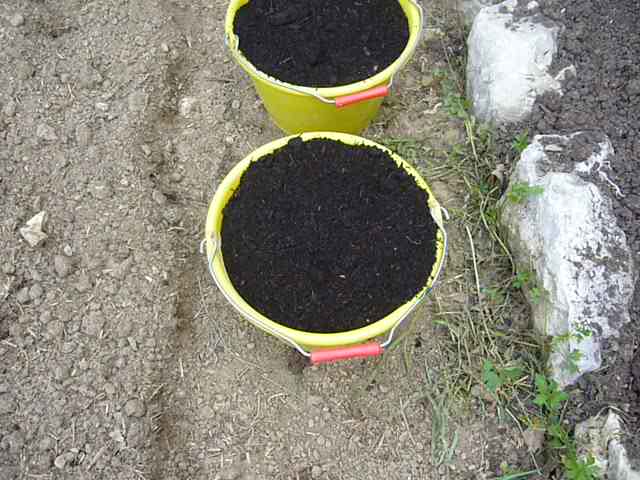 Les plants une fois repiqués, je dispose quelques poignées de migon broyé ( terreau de vieux fumier de mouton) au pied de chaque plant.