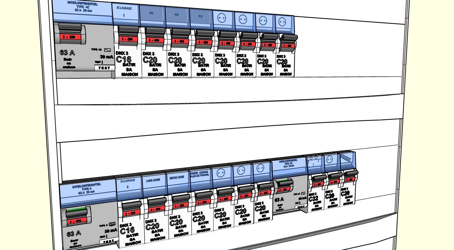 Le tableau principal de répartition sera composé selon l’importance de l’habitation, de plusieurs rangées de disjoncteurs divisionnaires protégés par des interrupteurs différentiels d’une sensibilité de 30 mA.