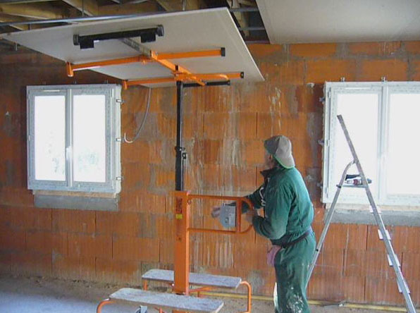 Nous nous sommes fait prêter par notre fournisseur de placo-plâtre un lève plaques, outil quasiment indispensable pour la mise en place au plafond !