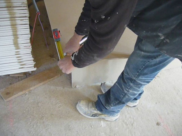 Avant toutes choses il faut tracer au sol tout le long des murs, l’empreinte des plaques à coller, a savoir 10cm =