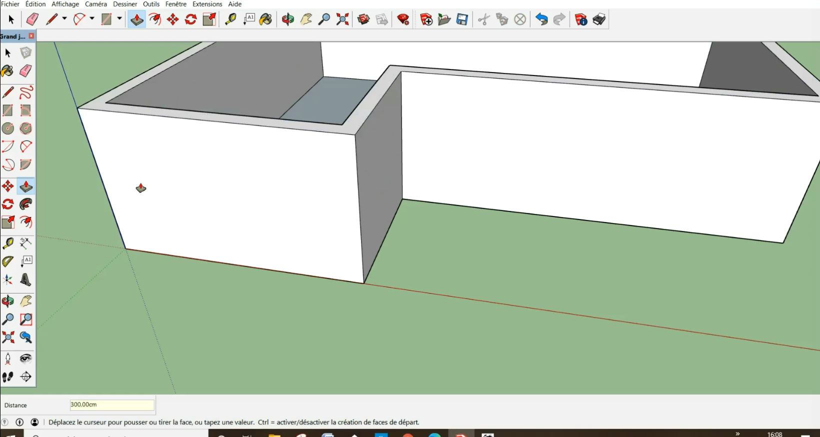 Je clique et je tire vers le haut. Je saisie alors 300 et « Entrée ». Ce qui revient à réaliser une élévation des murs maîtres de 300 cm de hauteur.
