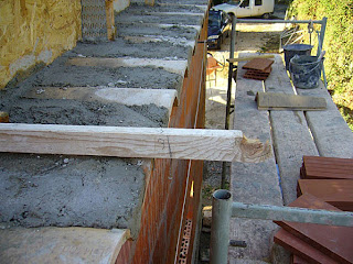 Tout d’abord un petit coffrage est installé entre les fermettes pour maintenir le mortier !