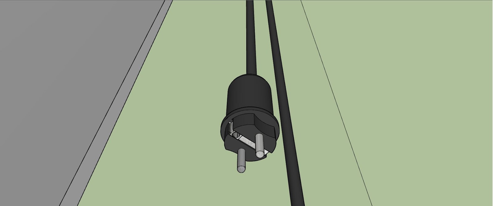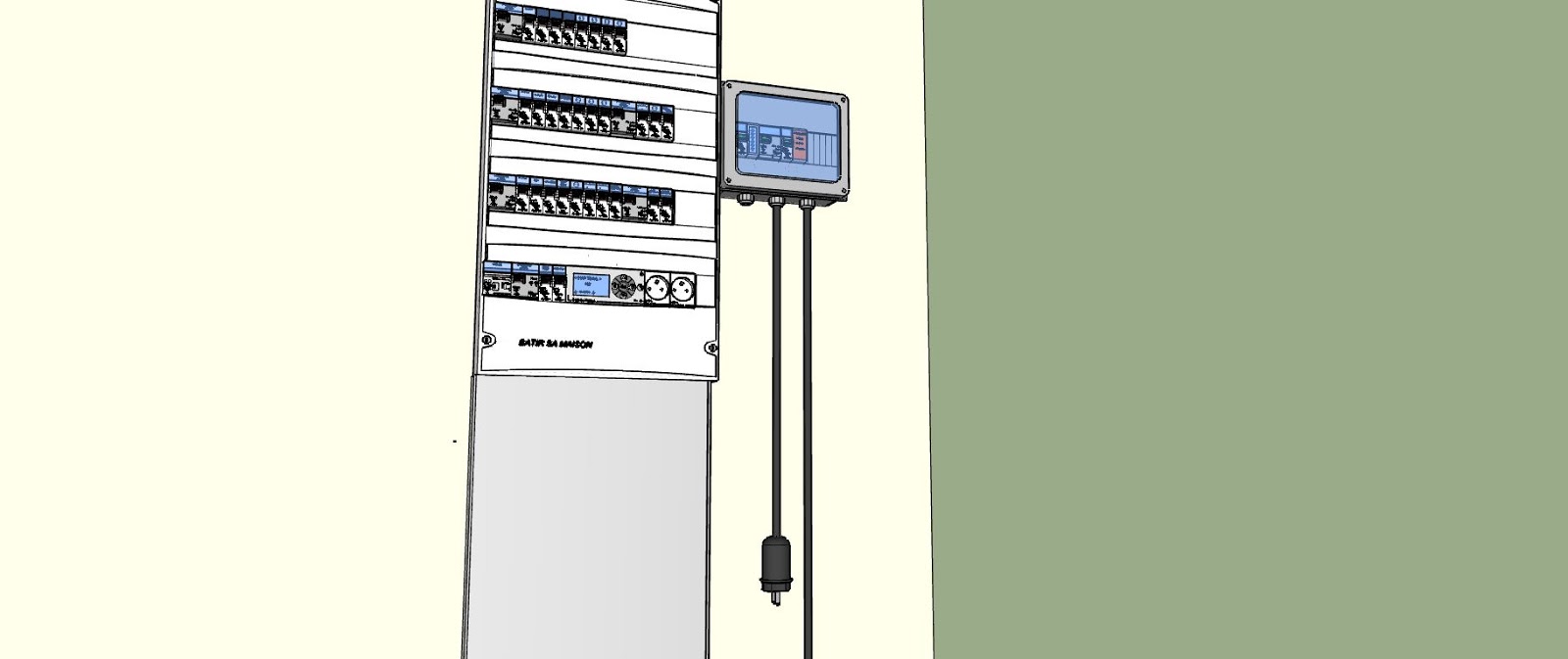 A la sortie de ce coffret, est branché un câble muni d’une fiche mâle pour brancher tout simplement sur une prise du tableau de répartition protégée par un disjoncteur d’au moins 16 A