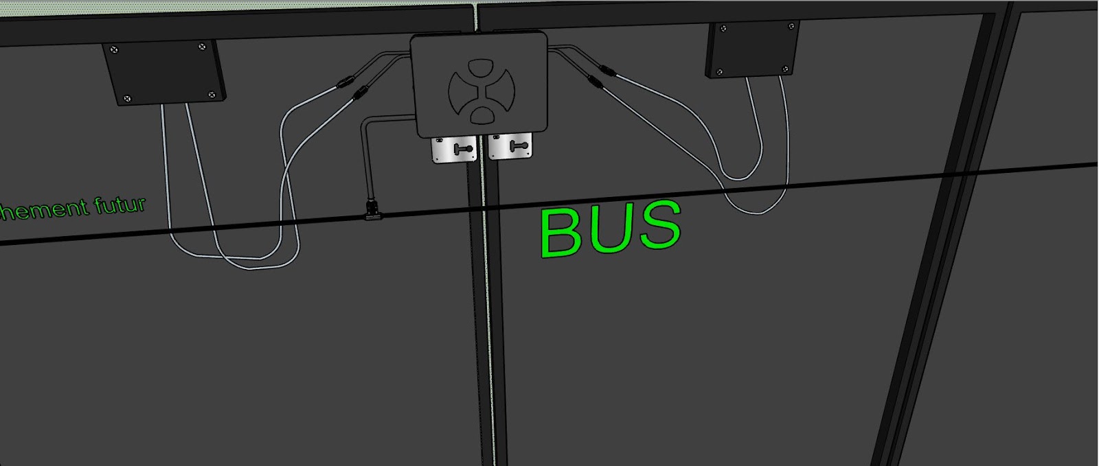 Le branchement est lui aussi très simple, les panneaux de chaque module, sont reliés à un micro-onduleur, et les onduleurs sont reliés à un câble appelé BUS, car c’est lui qui conduit l’électricité jusqu’au tableau de répartition de l’installation.